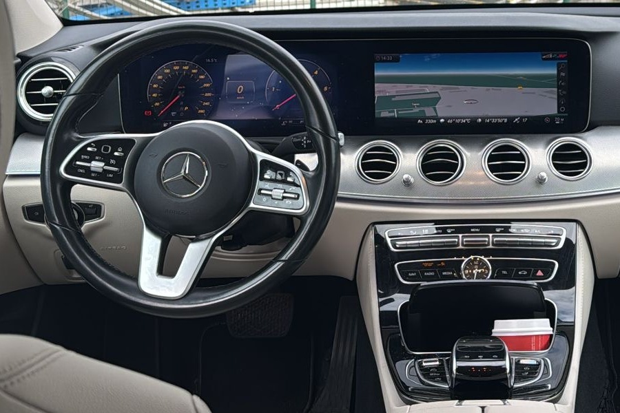 Mercedes Benz E 4matic, dizel, avtomatski menjalnik, poraba 7 litrov na 100 km. Navigacija, bluetooth multimedija, pomoč pri parkiranju. Pet sedežev, pet vrat, prtljažnik sprejme do štiri kovčke in ročno prtljago. Vzvratna kamera, navigacija, android/apple multimedija.