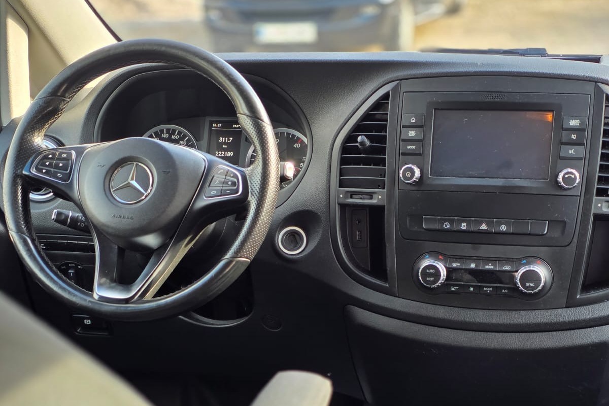 Mercedes Benz Vito Cargo+ 5 sedežev, dizel, avtomatski menjalnik, poraba 8 litrov na 100 km. Navigacija, bluetooth multimedija, pomoč pri parkiranju. Pet sedežev, pet vrat, prtljažnik sprejme do štiri kovčke in ročno prtljago. Vzvratna kamera, navigacija, android/apple multimedija.